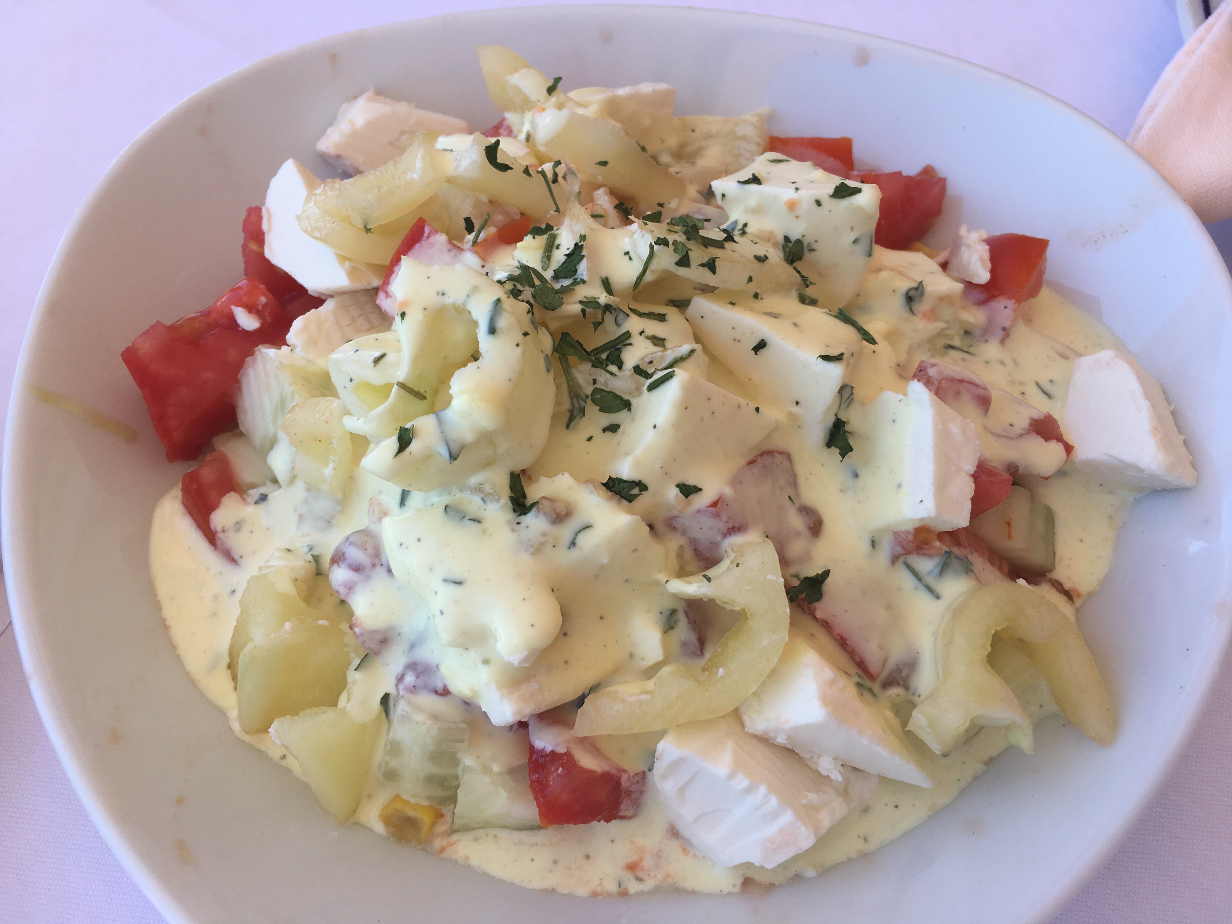 I thought I ordered what looked like a Greek salad in the picture…. not exactly. It was really good though. It tasted kind of like egg salad with bell peppers, tomatoes, and a feta-like cheese. Really good!