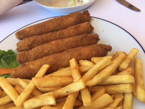 Ham, cheese, and chicken roll-ups with fries. It was good. Heavy, but good.