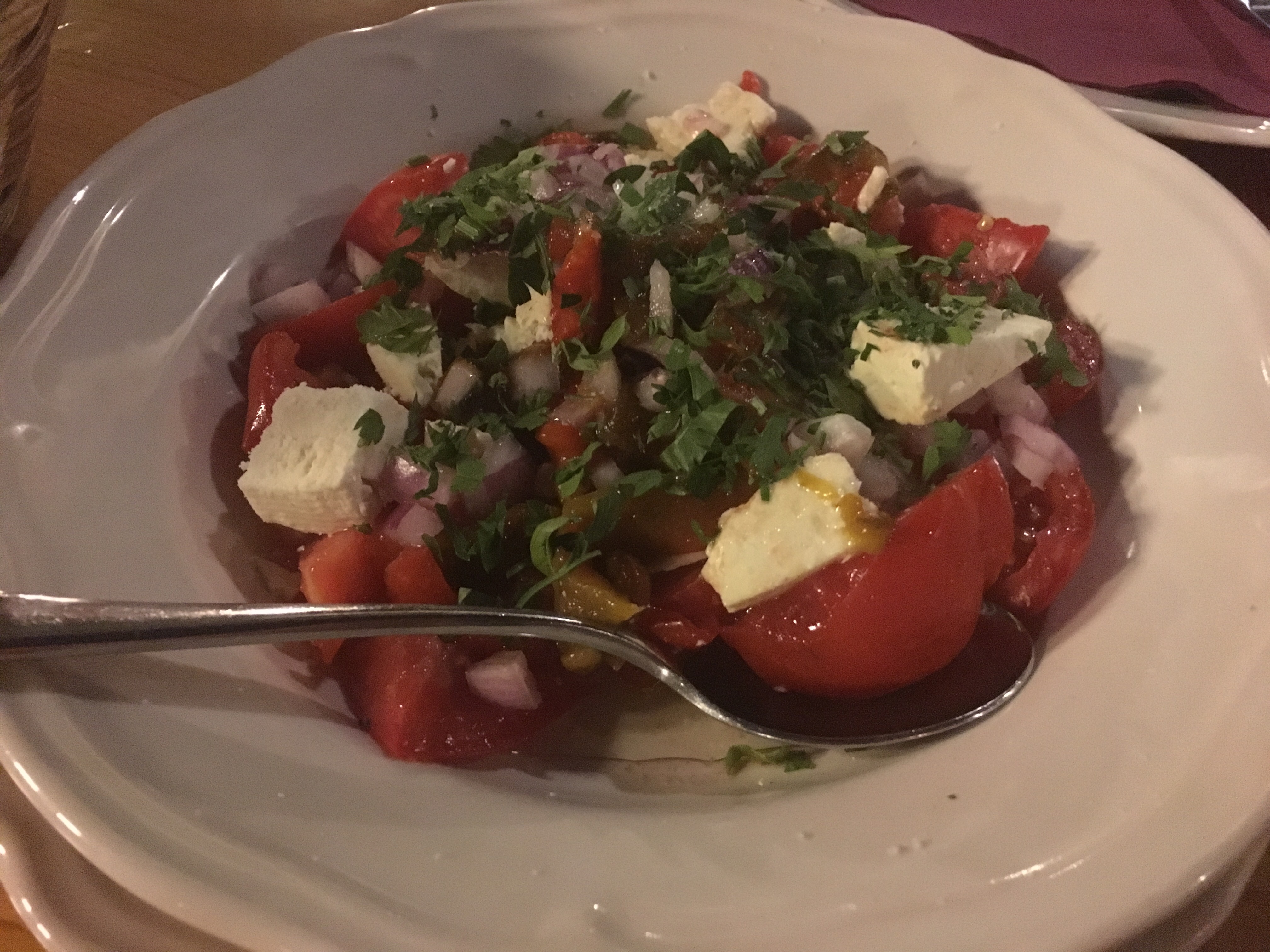Macedonian salad- tomato, feta, parsley, onion, and roasted peppers in a light olive oil dressing. Delicious!