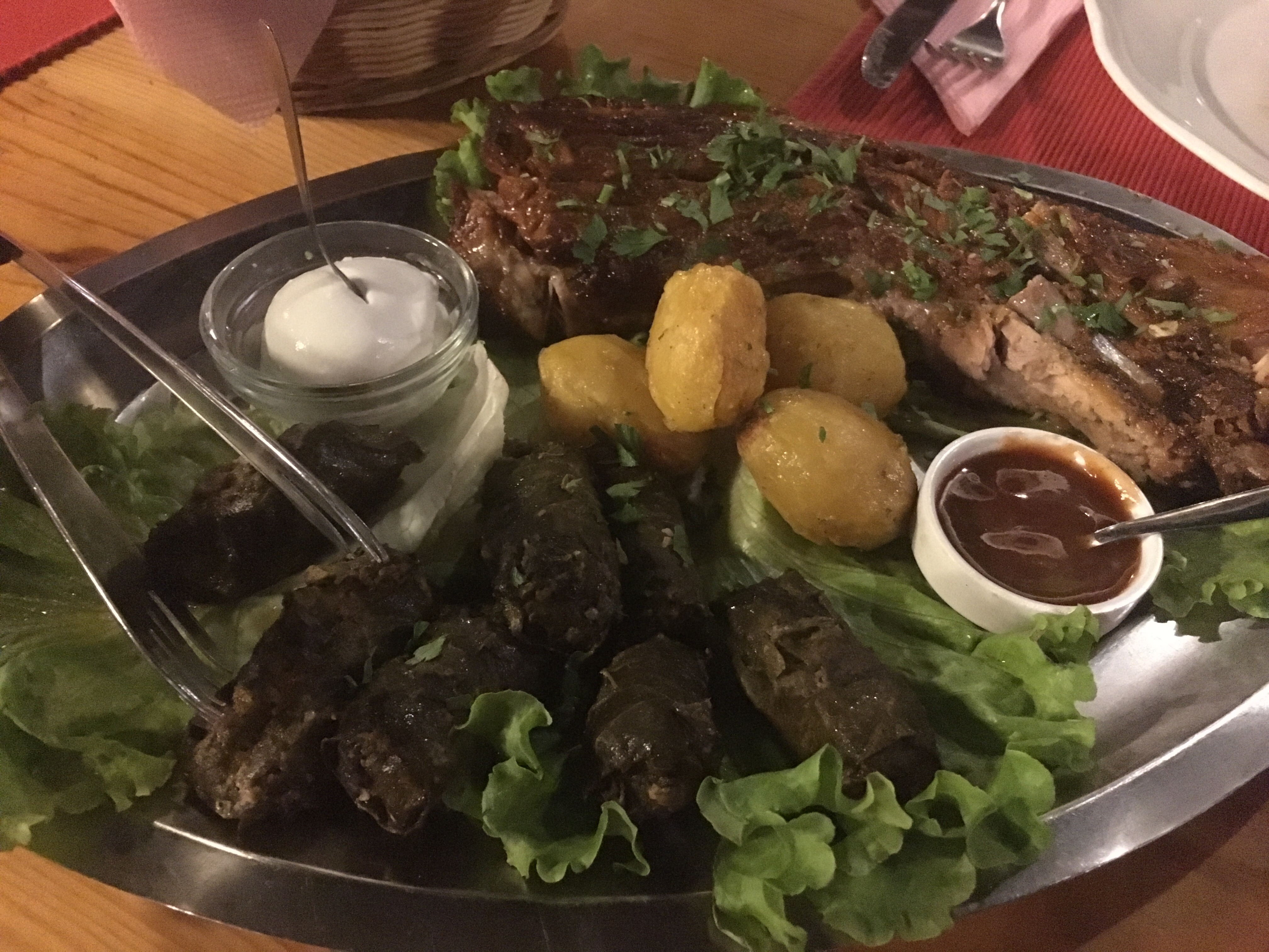Stuffed grape leaves and roasted pork ribs with potatoes. We did t love either of these dishes. They were served warm-ish which didn’t help. Honestly though, I think the biggest problem was the huge, delicious salad we ate first. We just weren’t that hungry by the time the mains arrived.