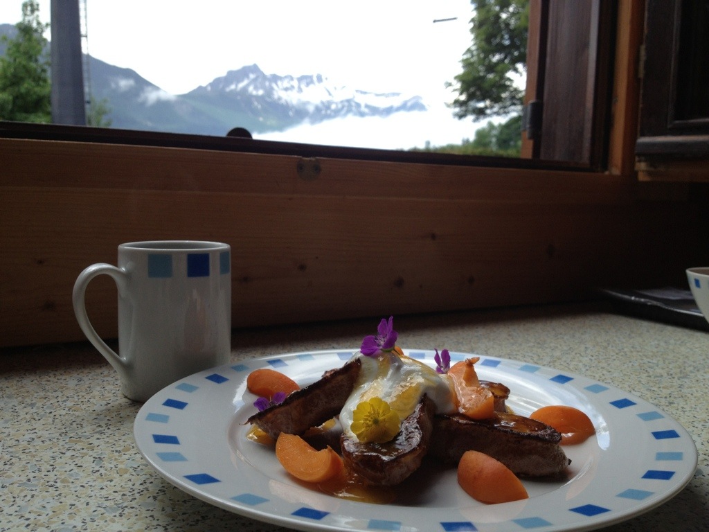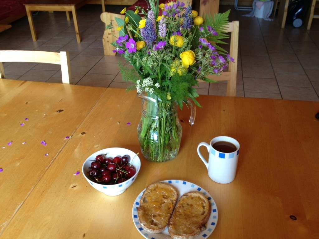 I melted some apricot jam and cut up some fresh apricots. Then I plopped a generous portion of fromage blanc in the middle and topped it all with the melted jam, fresh apricots and alpine flowers. Served it with some bitter French roast coffee and voila- breakfast!