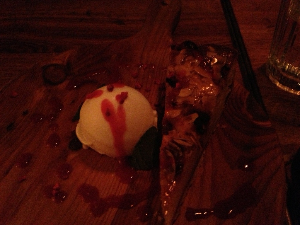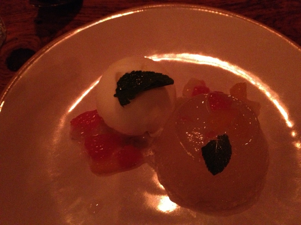 We finally found a restaurant that was “open”. I think it was actually a private Father’s Day party, but the woman felt sorry for us (I think. She only spoke French) and gave us a table. They had only one dish on offer- a strange duck covered in a creamy sauce with ratatouille, a puffy omelette thing, and bacon wrapped asparagus. It was all very good actually. The nice woman then brought us a bowl of fromage blanc (fresh creamy cheese similar to yogurt) with sugar and a selection of cheeses. We thought lunch was done, but then she brought us an amazing dessert. A small almond cake covered in a creamy vanilla custard then topped with a spectacular apricot gel and fresh crushed pistachios and almonds. It was surrounded by a mote of cream and strawberry coulis- the best part of the meal! The dessert was spot on!
