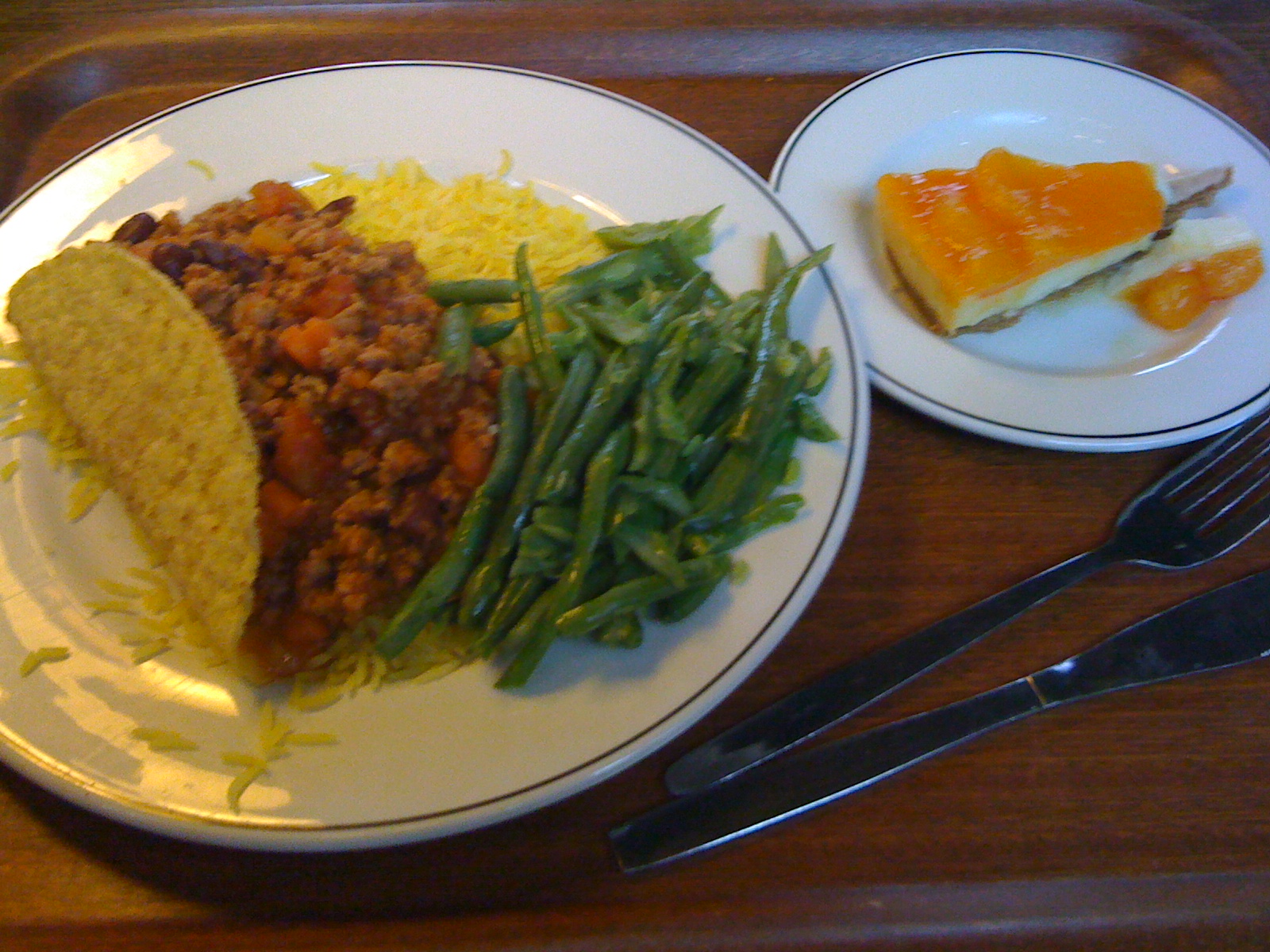 "Tacos" with rice and green beans and cheesecake, Oriel College dining hall, Oxford, UKThis was a funny one. The menu said we were to have “tacos” but when we came through the line this is how it went: