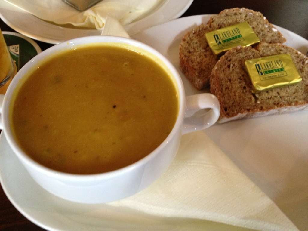 A quick, shared lunch at London’s Natural History museum. Onion and cheddar crisps with a roasted red pepper and arugula sandwich. as well as a very tasty cappuccino. We’re headed to Jamie Oliver’s restaurant tonight, so we’re keeping it light.