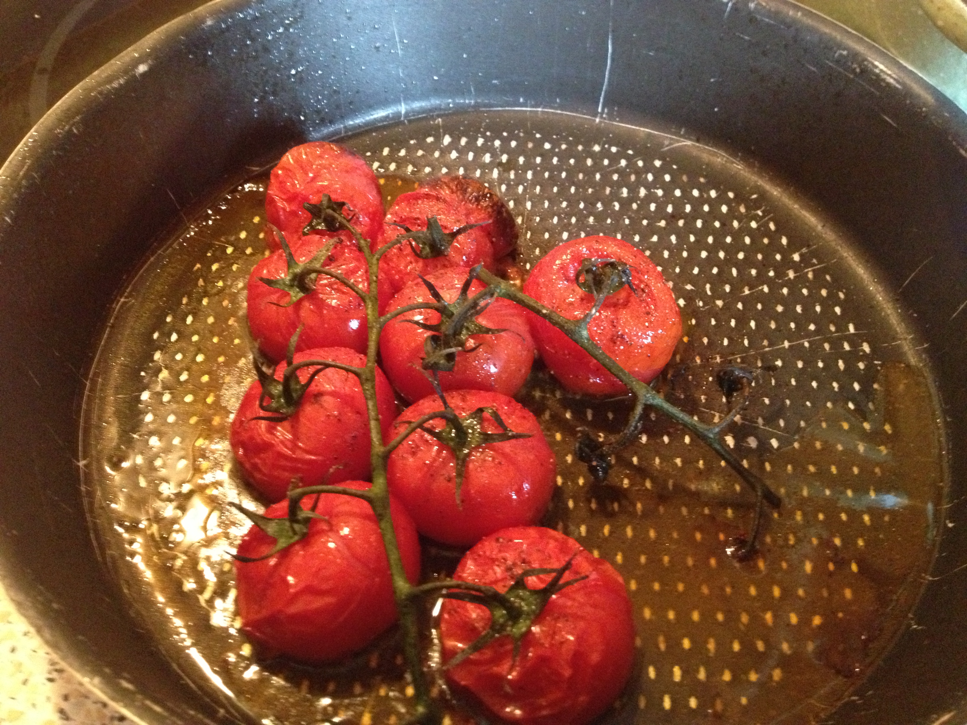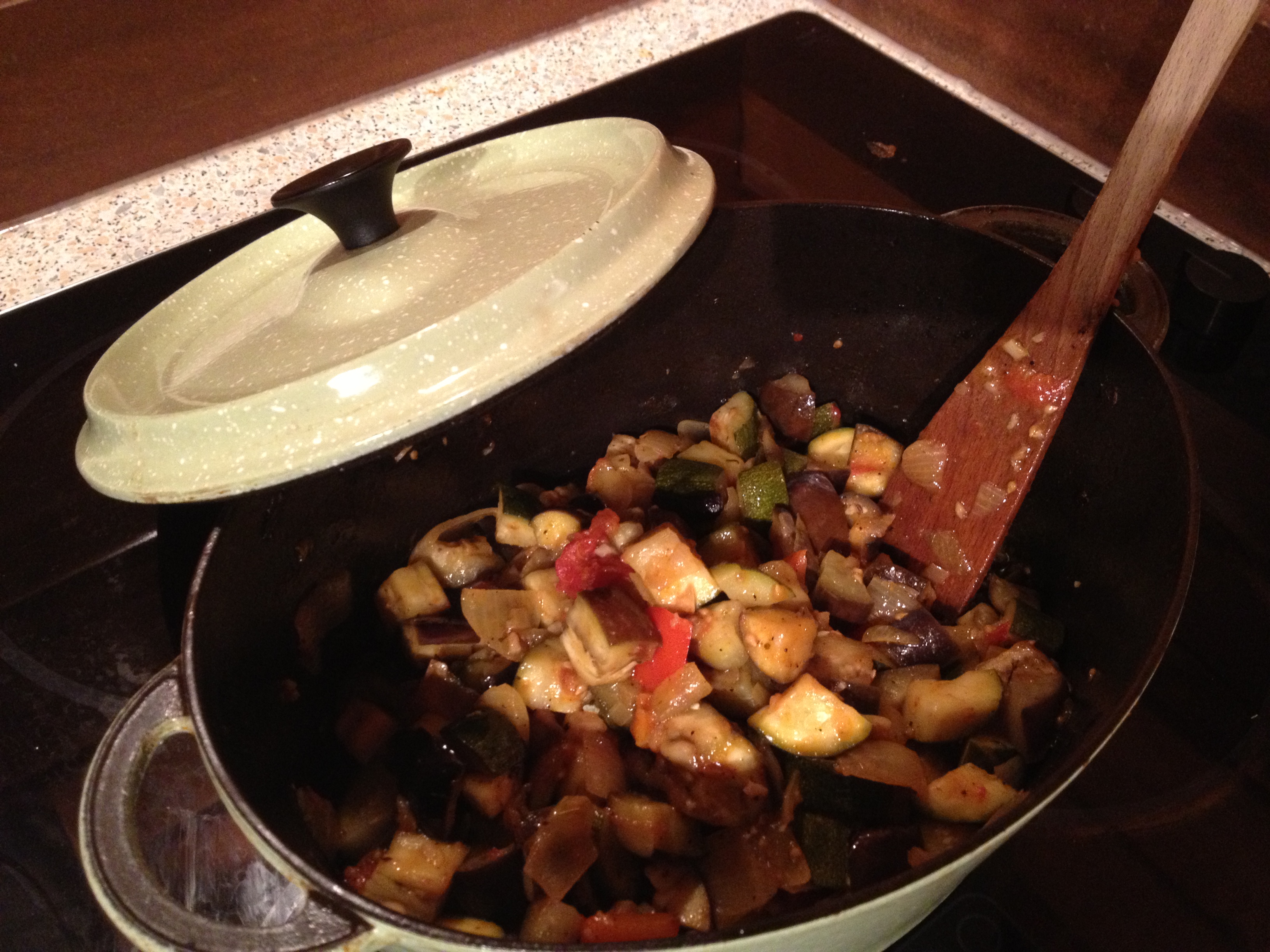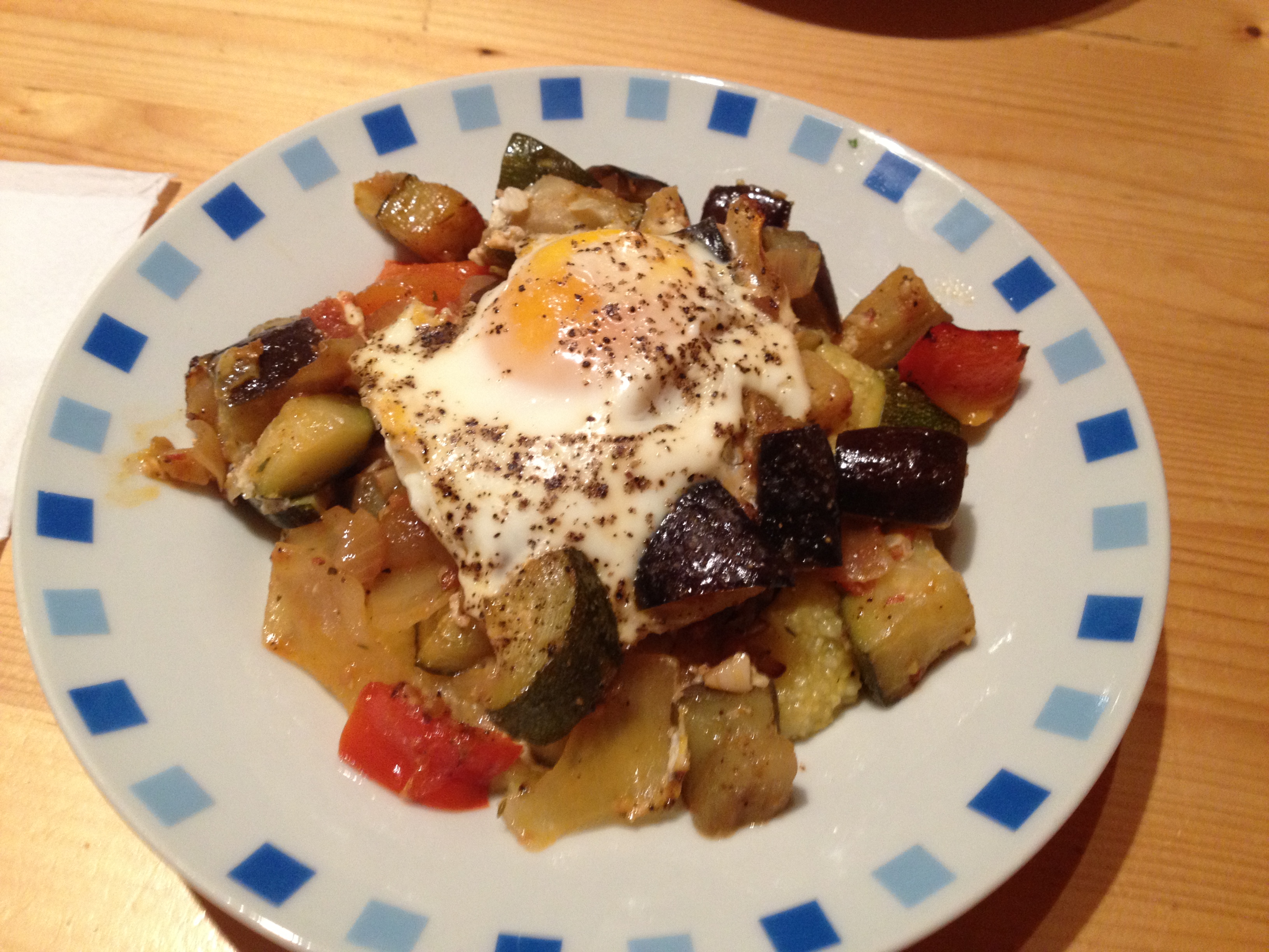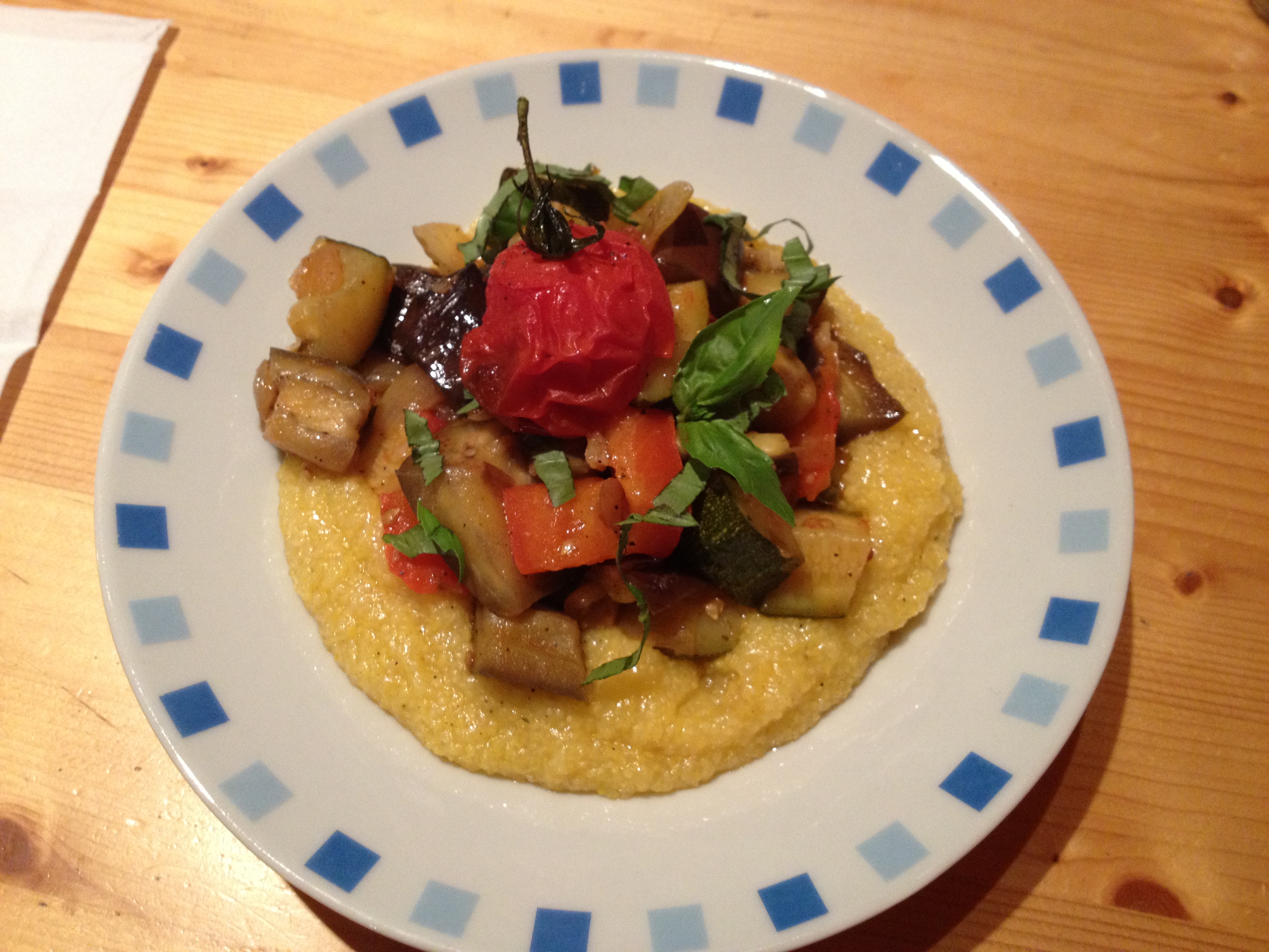 Now that we have a vegan on board, it’s been a fun challenge to come up with delicious, vegan food. Dinner tonight was a great success! Yum! I made country ratatouille with oven roasted tomatoes, red bell peppers, zucchini, onion, garlic, and eggplant served over olive oil and bay polenta and garnished with basil . It was absolutely delicious! Another easy, healthy recipe to add to the weeknight regime. Adam didn’t think there was enough protein, so I baked a couple eggs in the ratatouille for him… that was tasty, too!