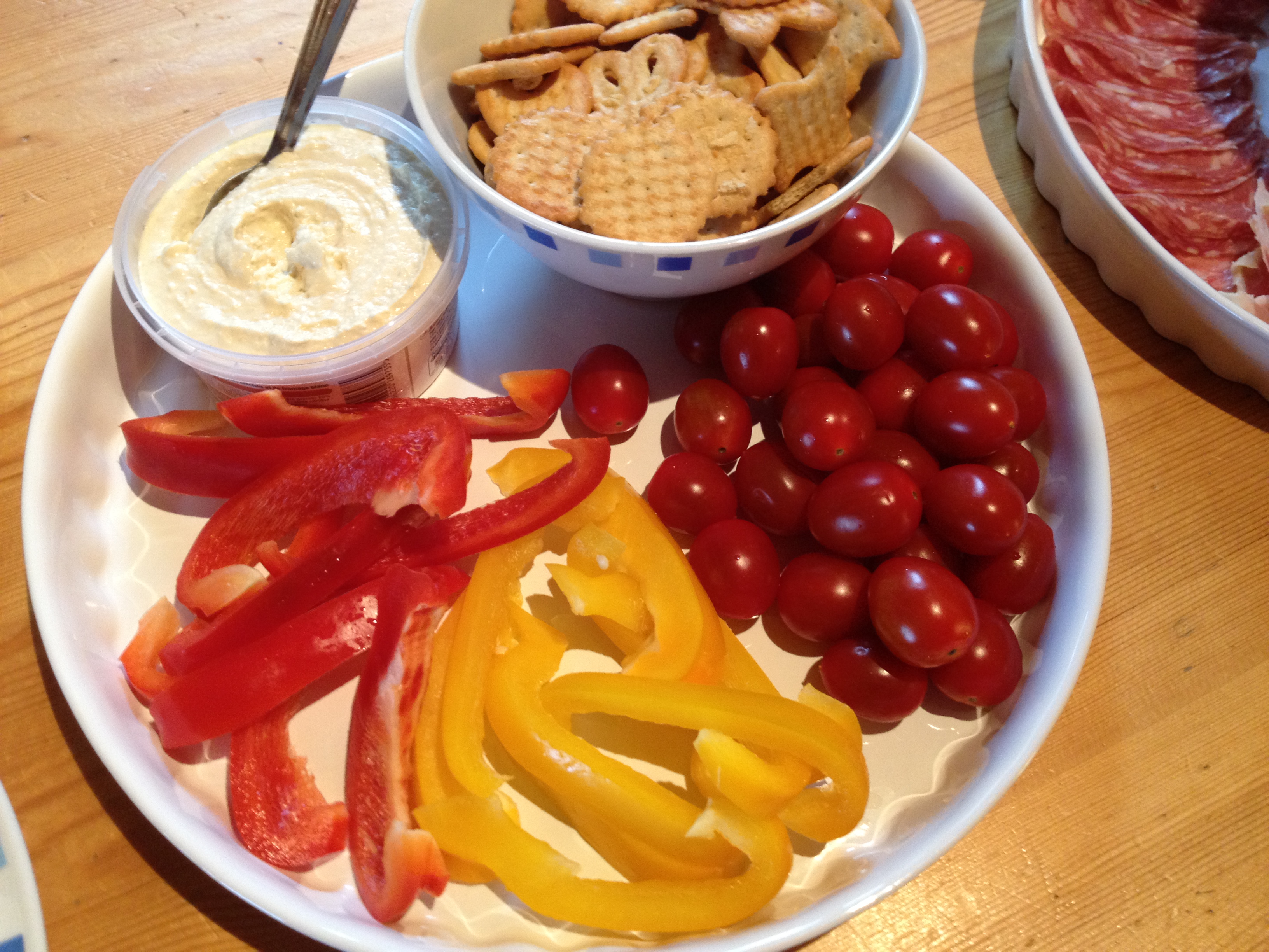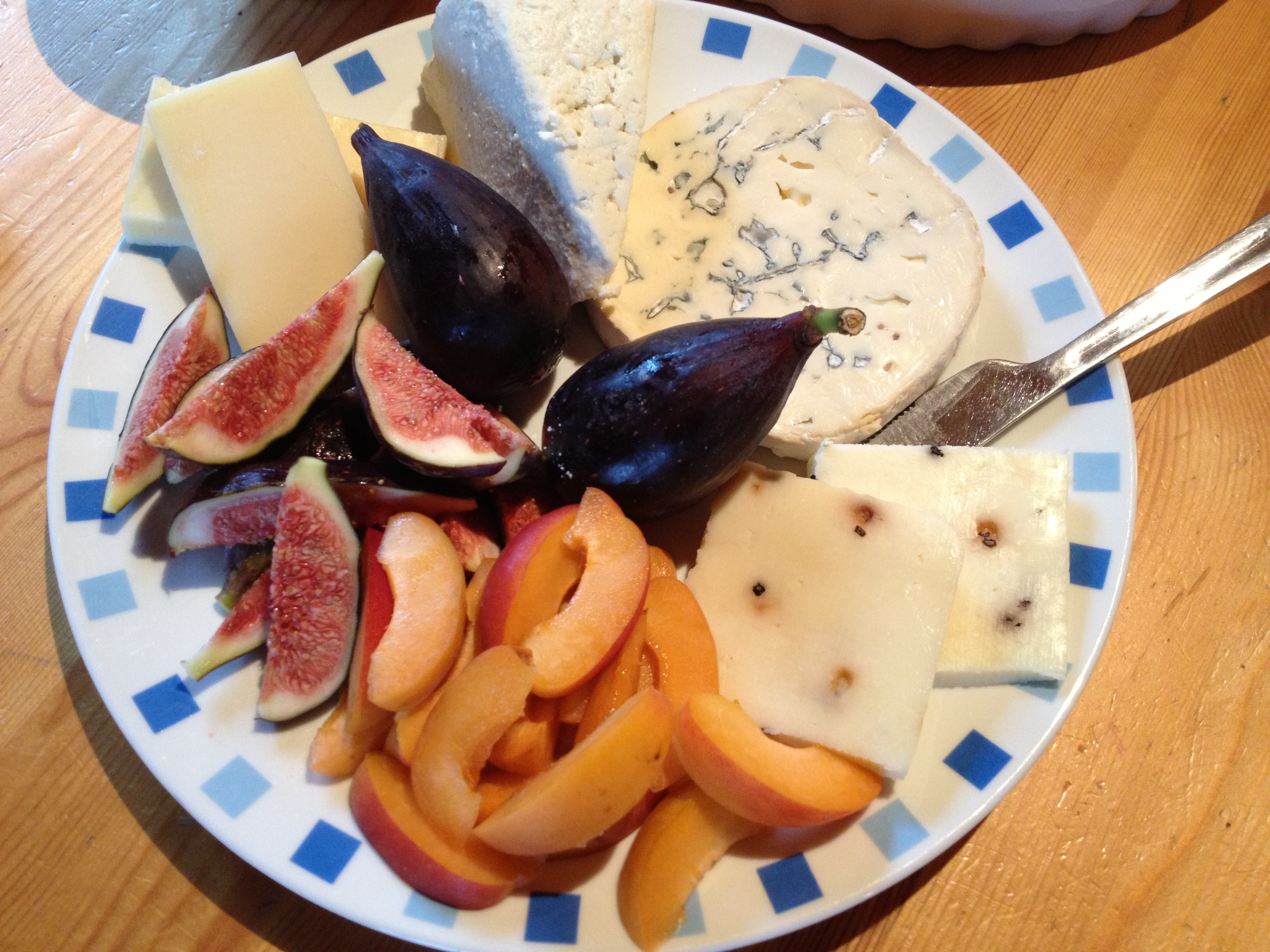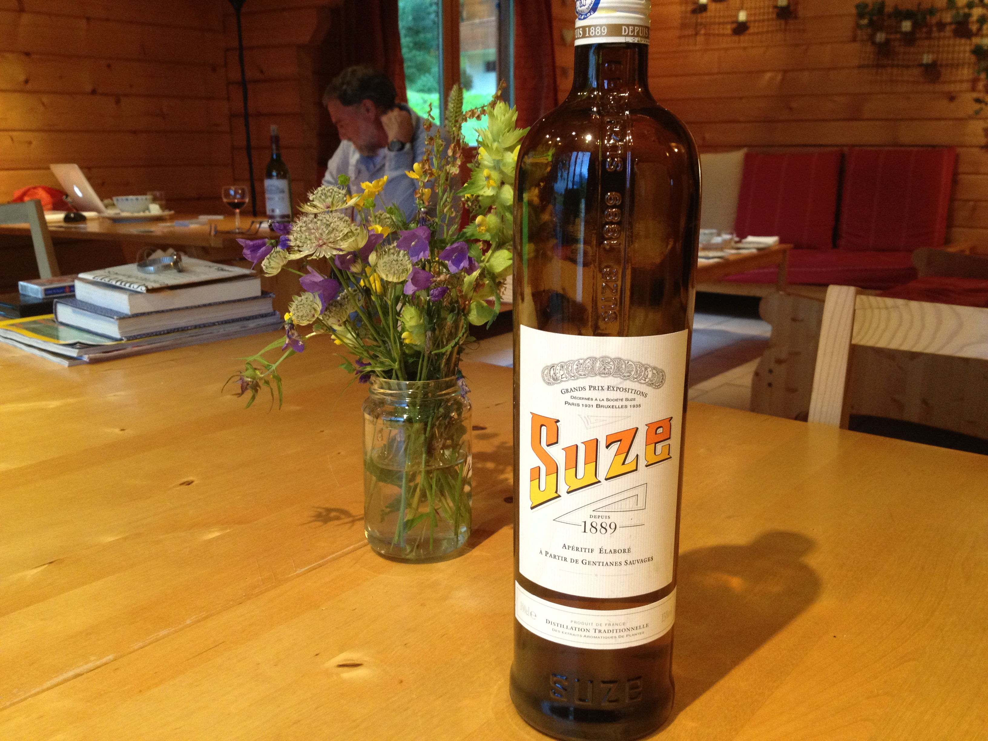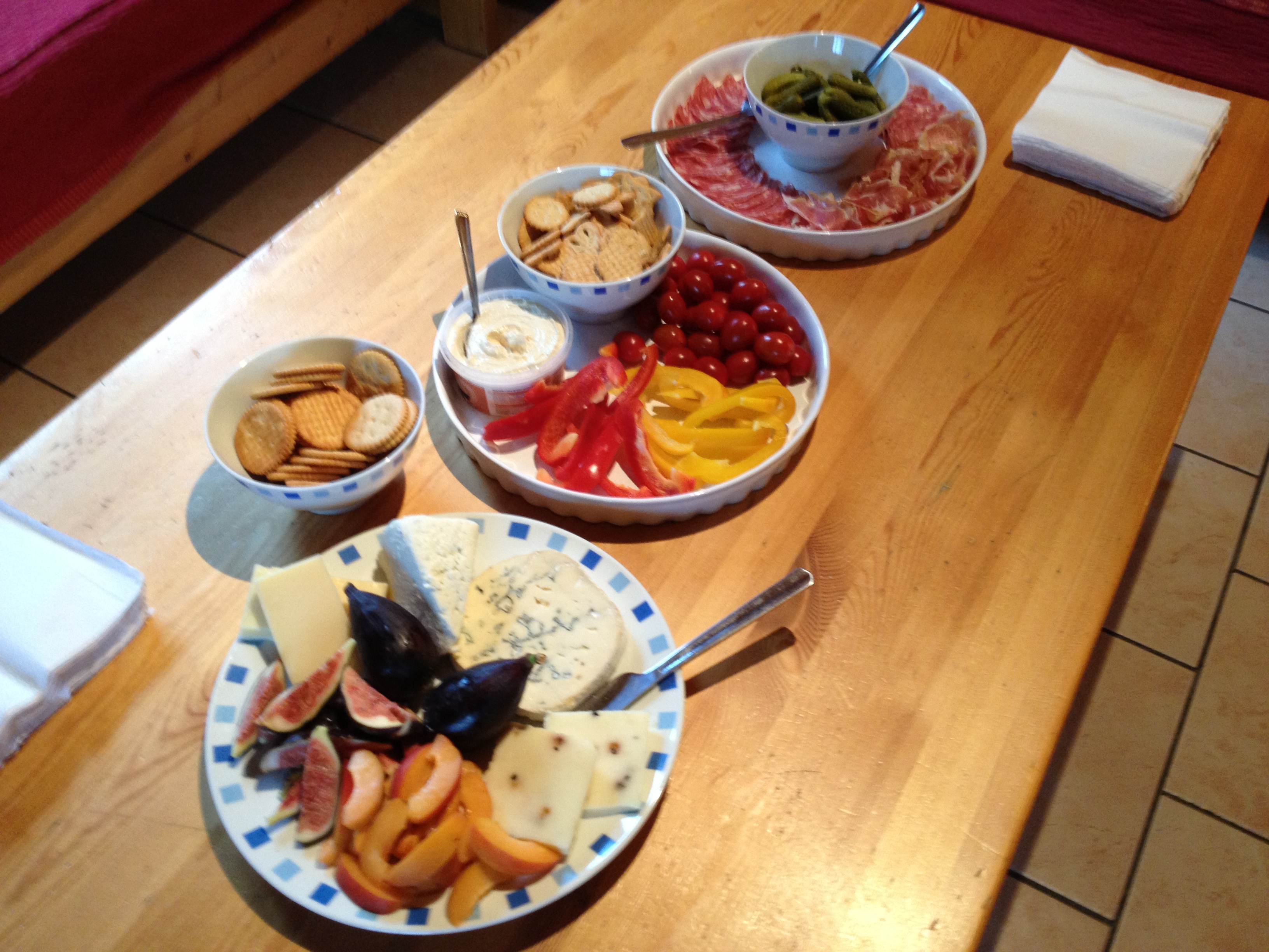 We had our neighbors over for aperitifs tonight. So fun! I served a selection of cheeses – some kind of blue goats cheese, fresh ricotta, young Pecorino Romano with pepper corns, and a Emmental de Savoie- all delicious with figs and apricots. I also served Jambon de Savoie and salami with cornichon and a lovely vegetable platter with hummus. We drank Suze – an excellent, very bitter, herbal aperitif. We had a great time! I always love entertaining and we had the added bonus of a slight language barrier – fun! 🙂
