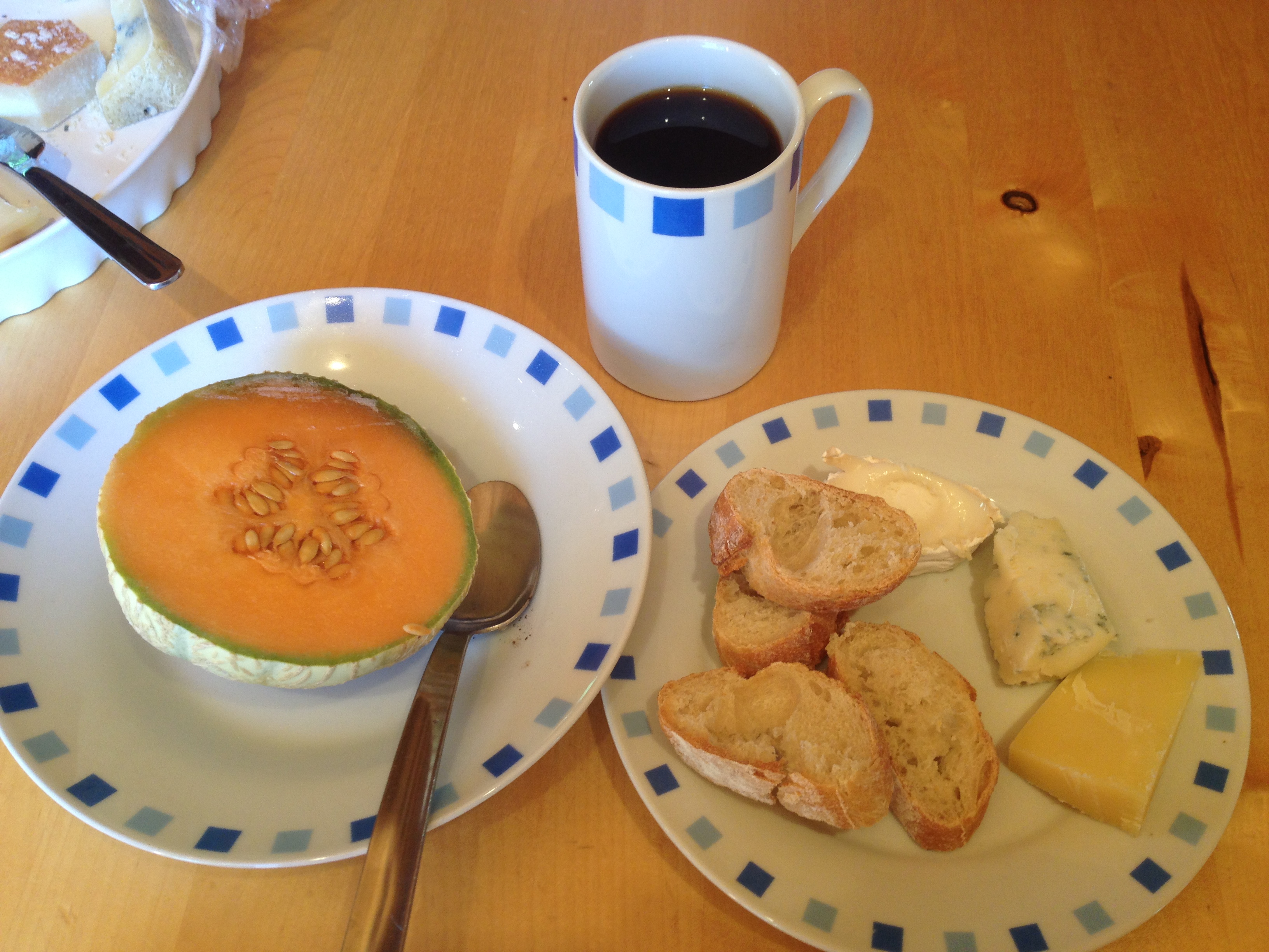Simple and delicious! Toasted baguette with chevre, blue cheese, and Beaufort with half a mini melon. Yum!