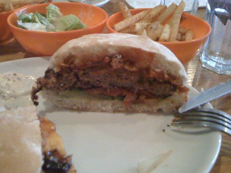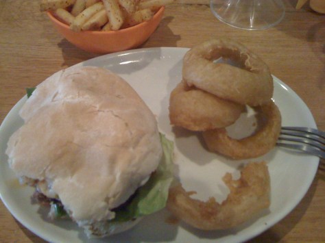 Charity had the bacon barbeque cheeseburger with carmelized onions. The burger was greasy and delicious. I enjoyed the real bacon after only getting English bacon for the last week. It was really good but I couldn’t finish it, I only ate half. The chips were nice and spicy, and the milkshake was sweet and refreshingly cold.