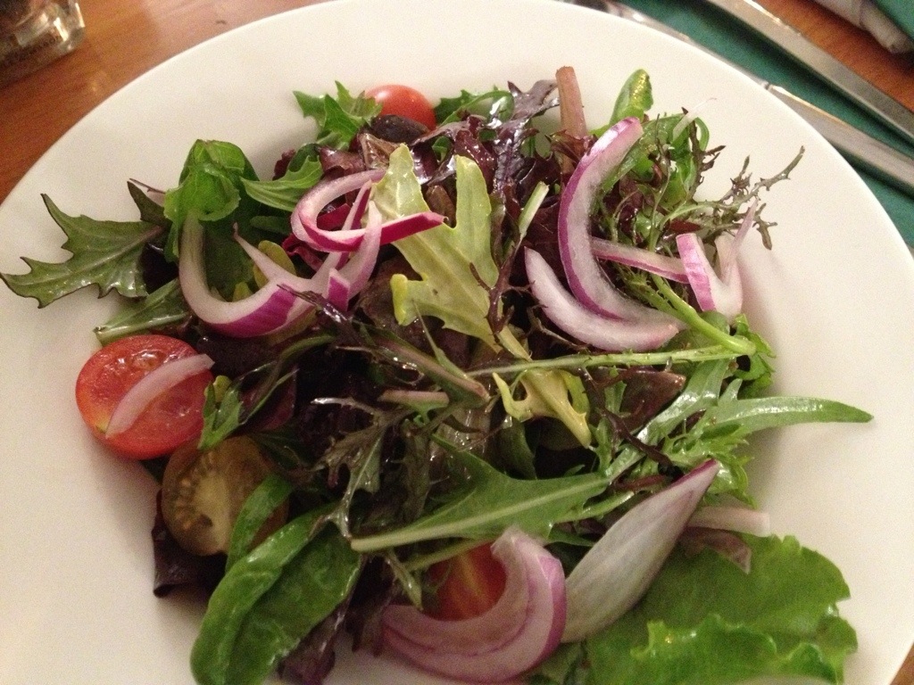 This salad jumped right out of the menu at me. Who wouldn’t want to eat a mushroom and bacon salad? The salad was made up of a buttery lettuce somewhat like Boston, tomato wedges, cucumber slices and crunchy croutons with a creamy dressing. The salad itself was a good salad, but then they decided to make it an awesome salad so they topped it with a heaping pile of warm mushrooms and bacon. The bacon was awesome, like it always is when it’s actual bacon, from the belly. And the mushrooms were heavy and earthy. It was an incredible salad, one of the best salads I’ve ever had!