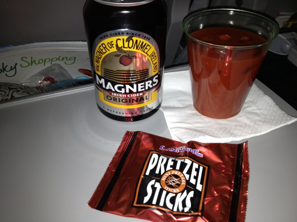Magner’s apple cider, spicy tomato juice and pretzel sticks.