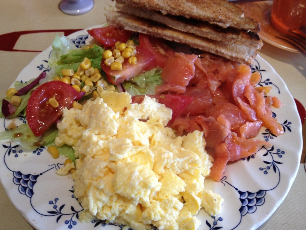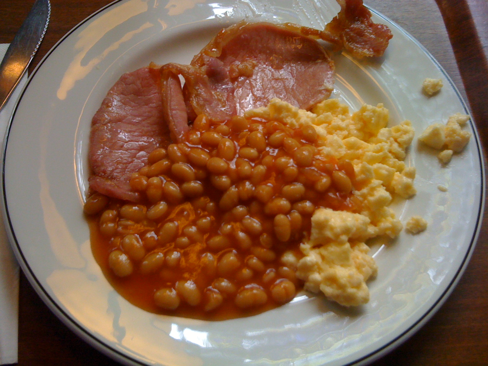 “Bacon” which is really more like ham as it is cut from the shoulder instead of the belly where the real bacon comes from. Scrambled eggs today instead of fried, trying to stay fit, and a load of beans dumped wherever they will fit. Not the best breakfast ever, but for sure the funniest.