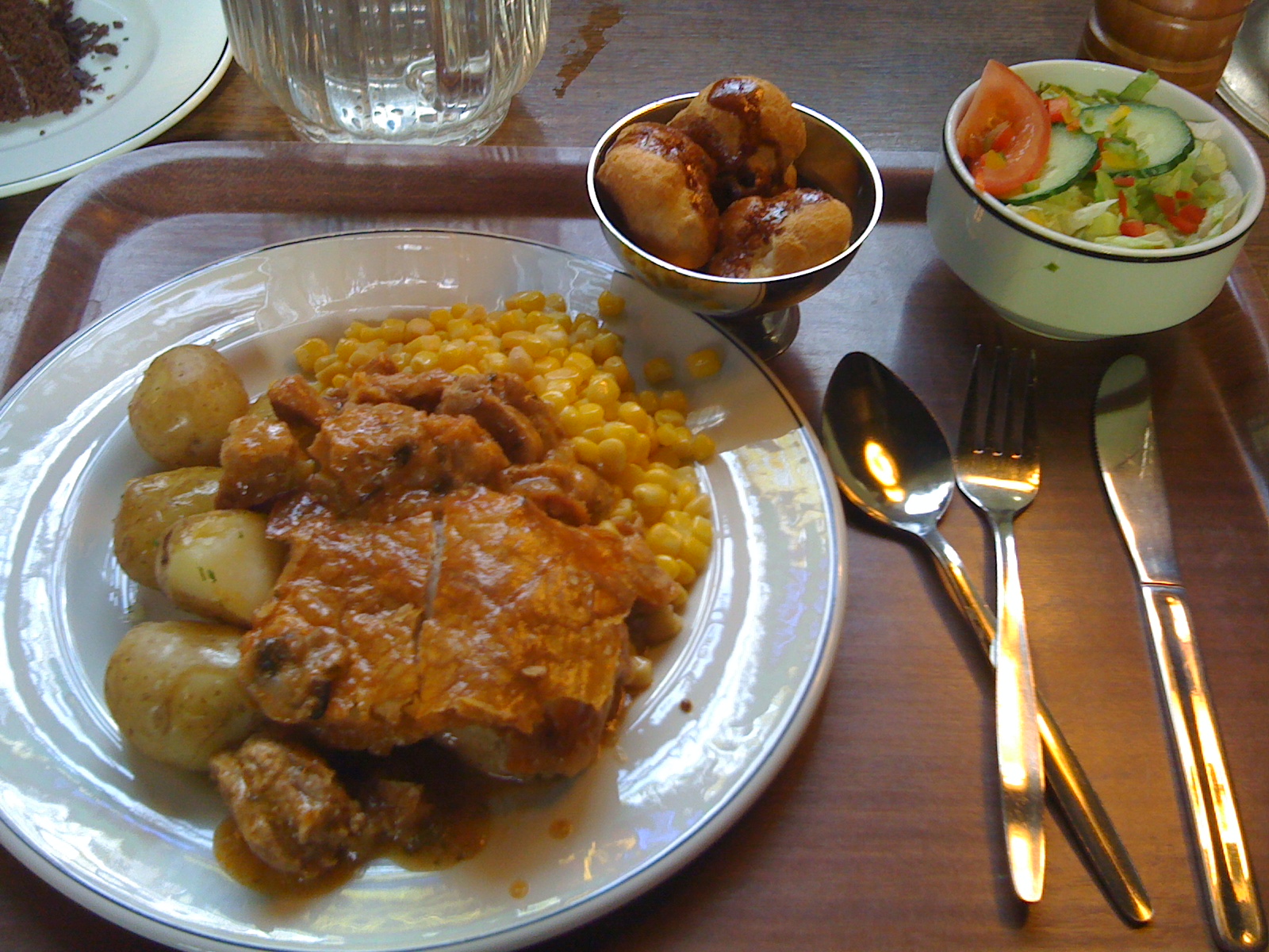 This was the best meal at the college so far! The pork and apple pie was so good, I ate an extra portion. It had big juicy chunks of pork in a lovely savory sauce. There were mushrooms, onions, and slices of apple in with the pork, all under a crispy, flaky, perfect philo dough. The potatoes and corn were nothing special, but the salad was very bland. The dessert was awesome though, cream puffs floating in a dark chocolate bath! I wish they made this for me every night!