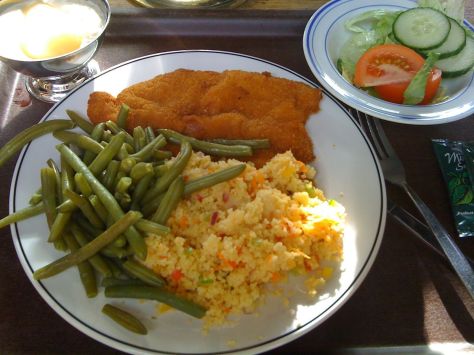 This was one of the best dinners at the college so far. It wasn’t very English, but it was simple and well prepared. The pork cutlets were breaded and then baked, they were crispy on the outside and juicy on the inside. The cous cous was wonderful with bits of onion, and peppers. The green beans were not over cooked, which is a big win for the college dining hall. Overall, a good home cooked meal, nothing amazing, but everything was well executed.