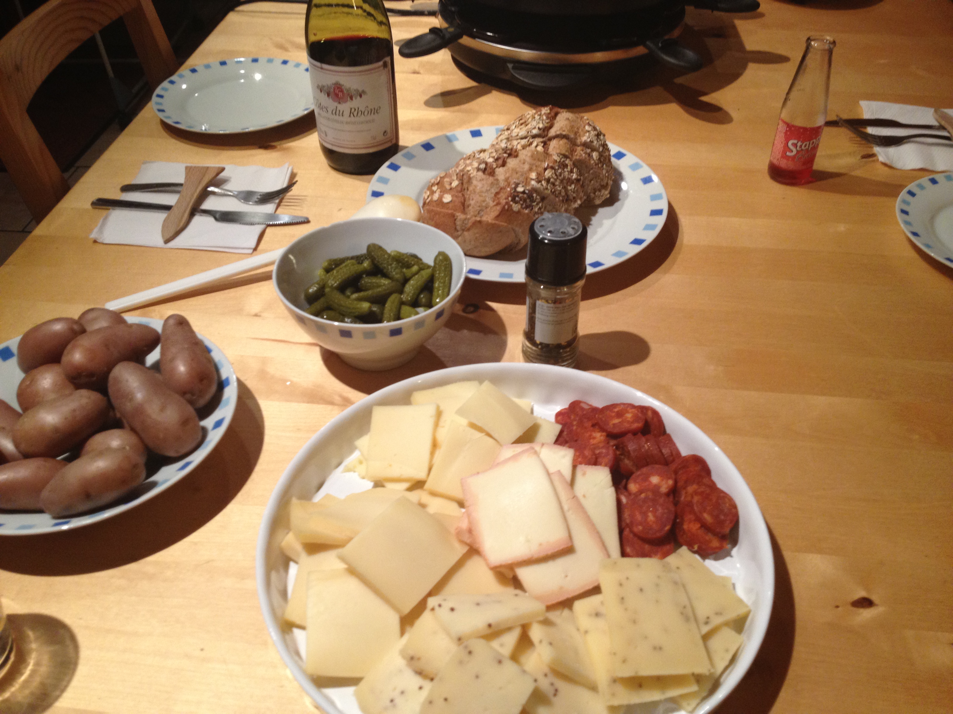 Lazy dinner 😉 I made a fresh green salad with lots of vegetables and a balsamic vinaigrette. We reheated leftover potatoes then placed cold Raclette cheese on top. We microwaved it all for 30 seconds, and voila! Lazy Raclette! Sorry Frenchies! It actually tasted very good 🙂
