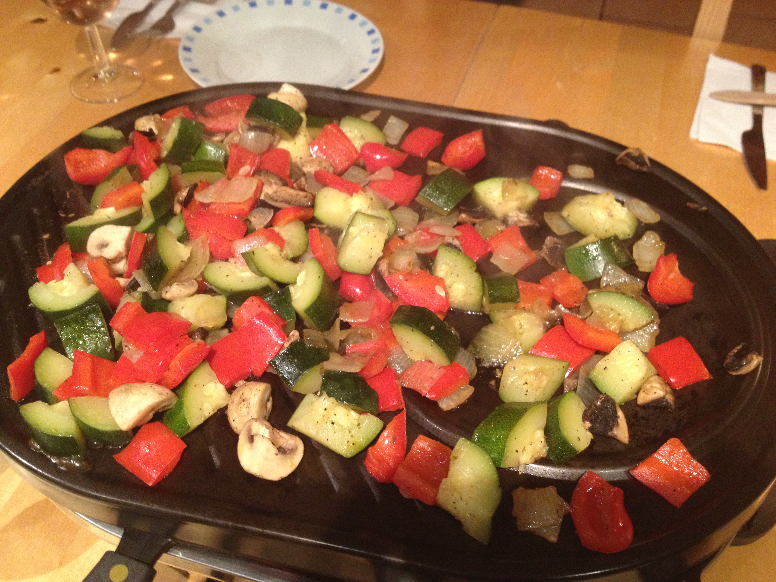 I started the meal with a generous glass of Bonal, of course. I made fresh green salads with a sharp mustard and red wine vinaigrette- just the way we like it. We also had skewers of onion, mushrooms, and zucchini, crusty French bread rubbed with garlic, and boiled baby potatoes. All covered in hot, bubbling slices of Raclette. Wow! I’m so glad Elodie taught us all about this fun and delicious French tradition!