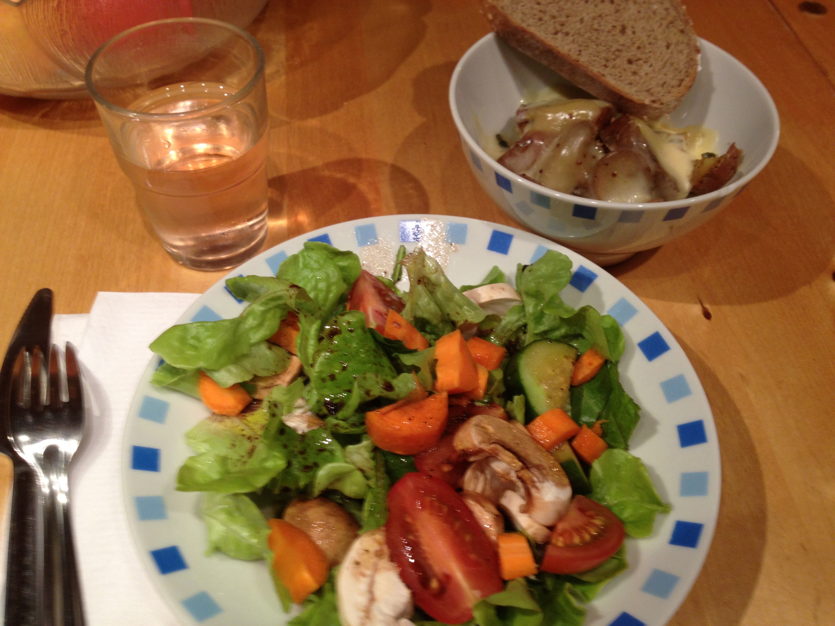 Lazy dinner ๐ I made a fresh green salad with lots of vegetables and a balsamic vinaigrette. We reheated leftover potatoes then placed cold Raclette cheese on top. We microwaved it all for 30 seconds, and voila! Lazy Raclette! Sorry Frenchies! It actually tasted very good ๐