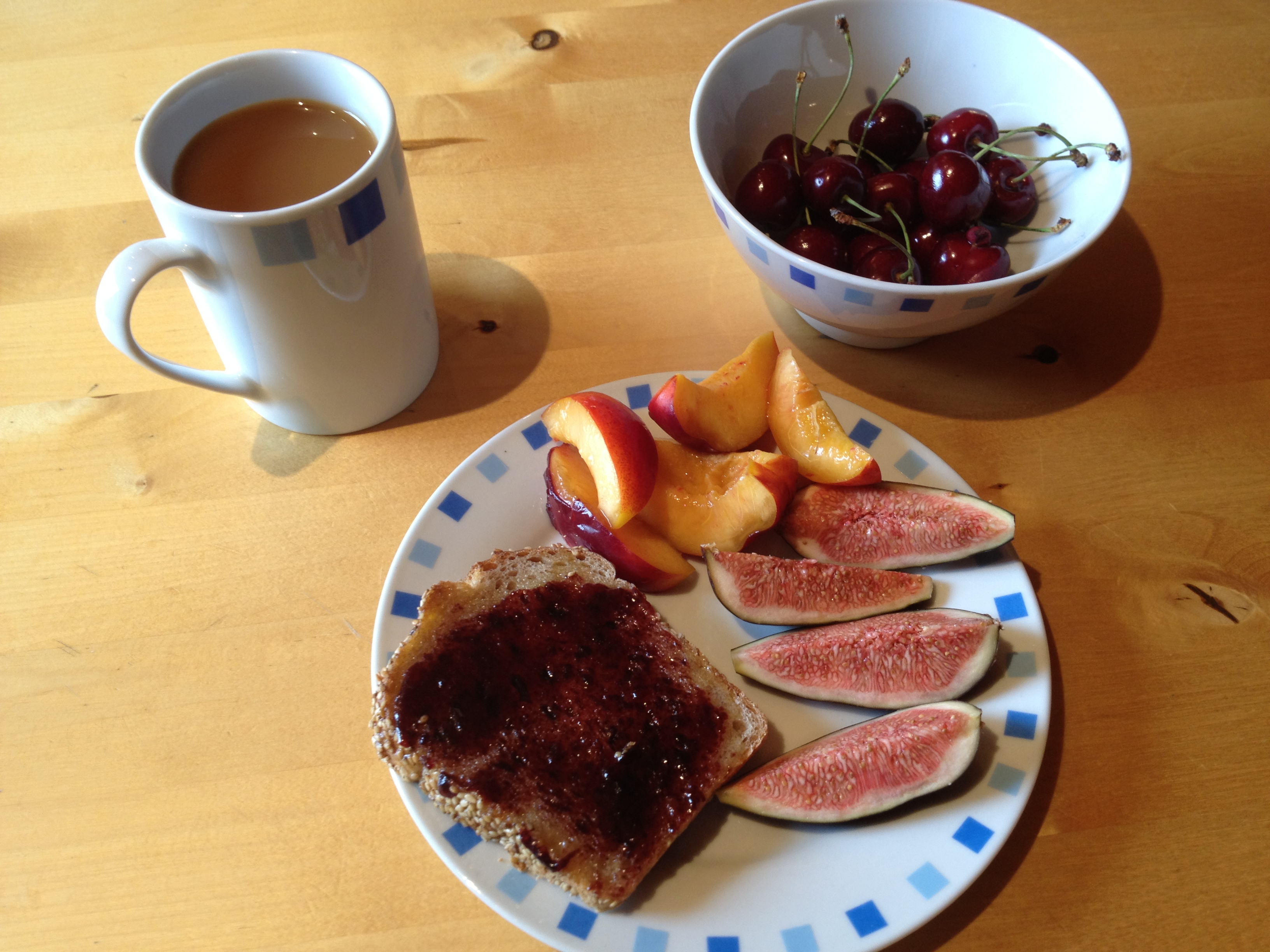 Yummy fruits! I love the produce here… I don’t know how or what they do to make it better, but it is. I think it may be because they allow produce to ripen before picking it. The figs, cherries, and nectarine were all perfect!