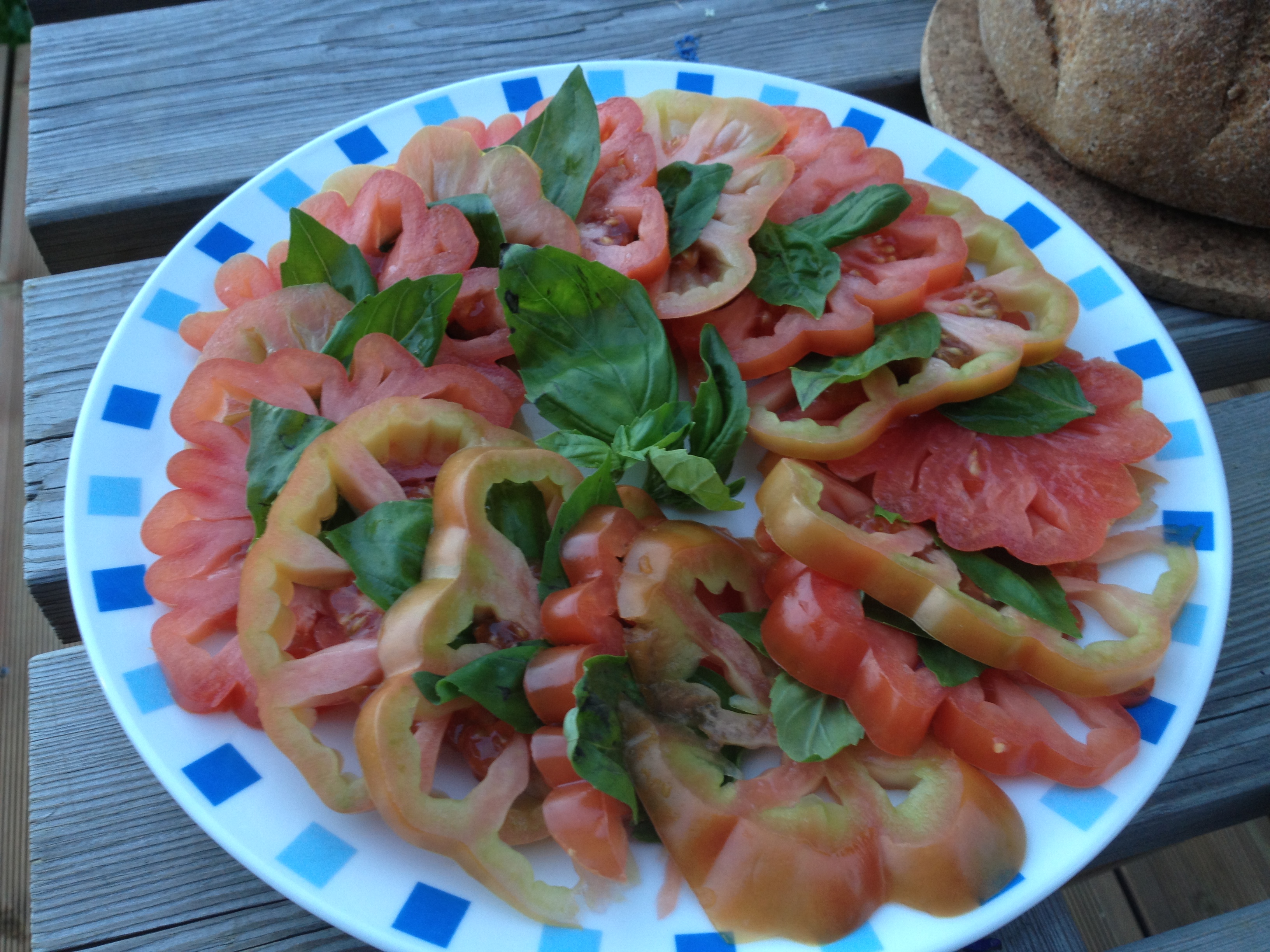 So I made a fabulous cheese platter with all the cheese we bought as well as a lovely tomato salad with crazy heirloom tomatoes, basil, olive oil, salt, and pepper. All served with amazing local wine, of course!
