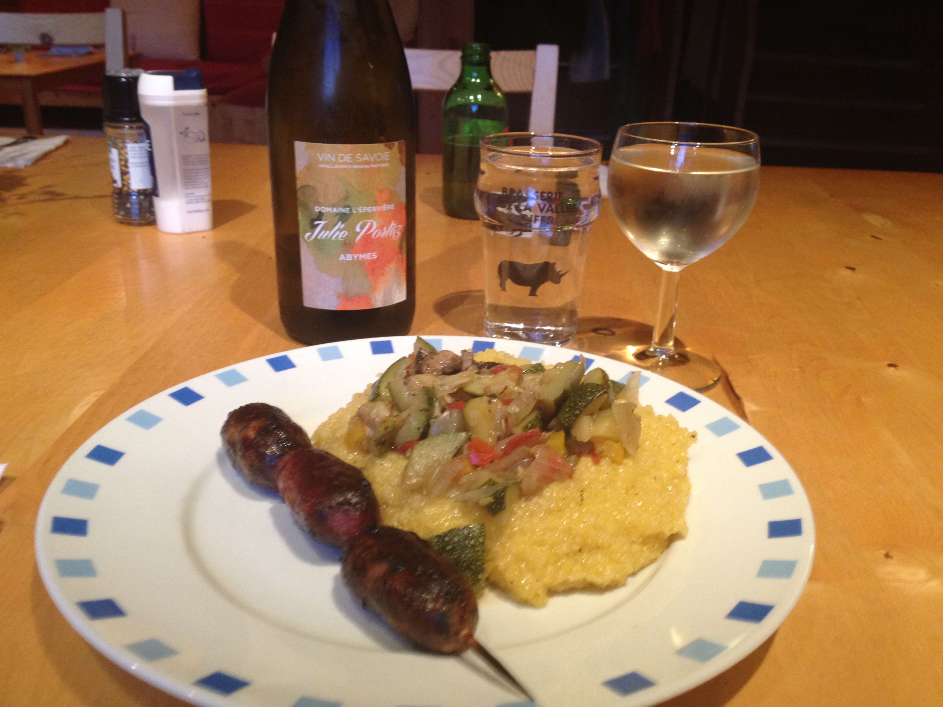We bought some sausage kabobs from a local producer – they’re so cute! I made polenta and a mixed vegetable sauté with zucchini, bell pepper, onion, garlic, tomato, and mushroom. It was all simple and good. Gary and Adam grilled the sausages and the meal was complete. Yum!